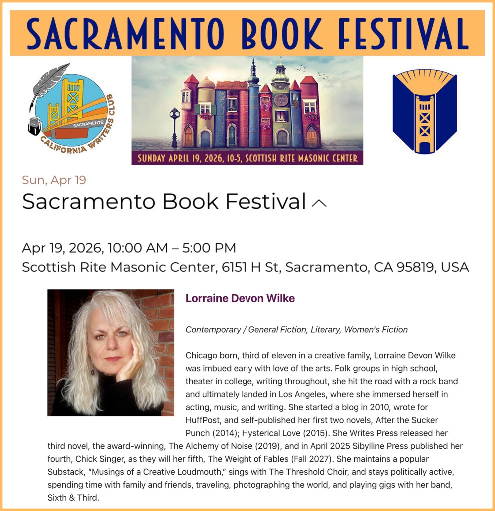 Lorraine will be appearing—along with a fascinating group of female authors—to meet readers and sign her novel, Chick Singer, at the Sibylline Press table at the Sacramento Book Festival. Come on by for a chat and a book … or several!